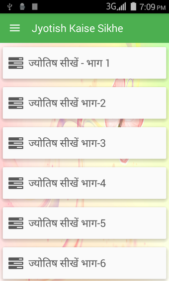 يحتوي التطبيق على ثلاثة أقسام: القسم الأول يحتوي على المفاهيم الأكثر أهمية في الأبراج الهندية الفيدية، والقسم الثاني يحتوي على معلومات تفصيلية. القسم الثالث يحتوي على مجموعة من القصص التي يمكن استخدامها للإرشاد في الحياة. تحتوي كل قصة على الكثير من المعلومات ولها معنى محدد.
